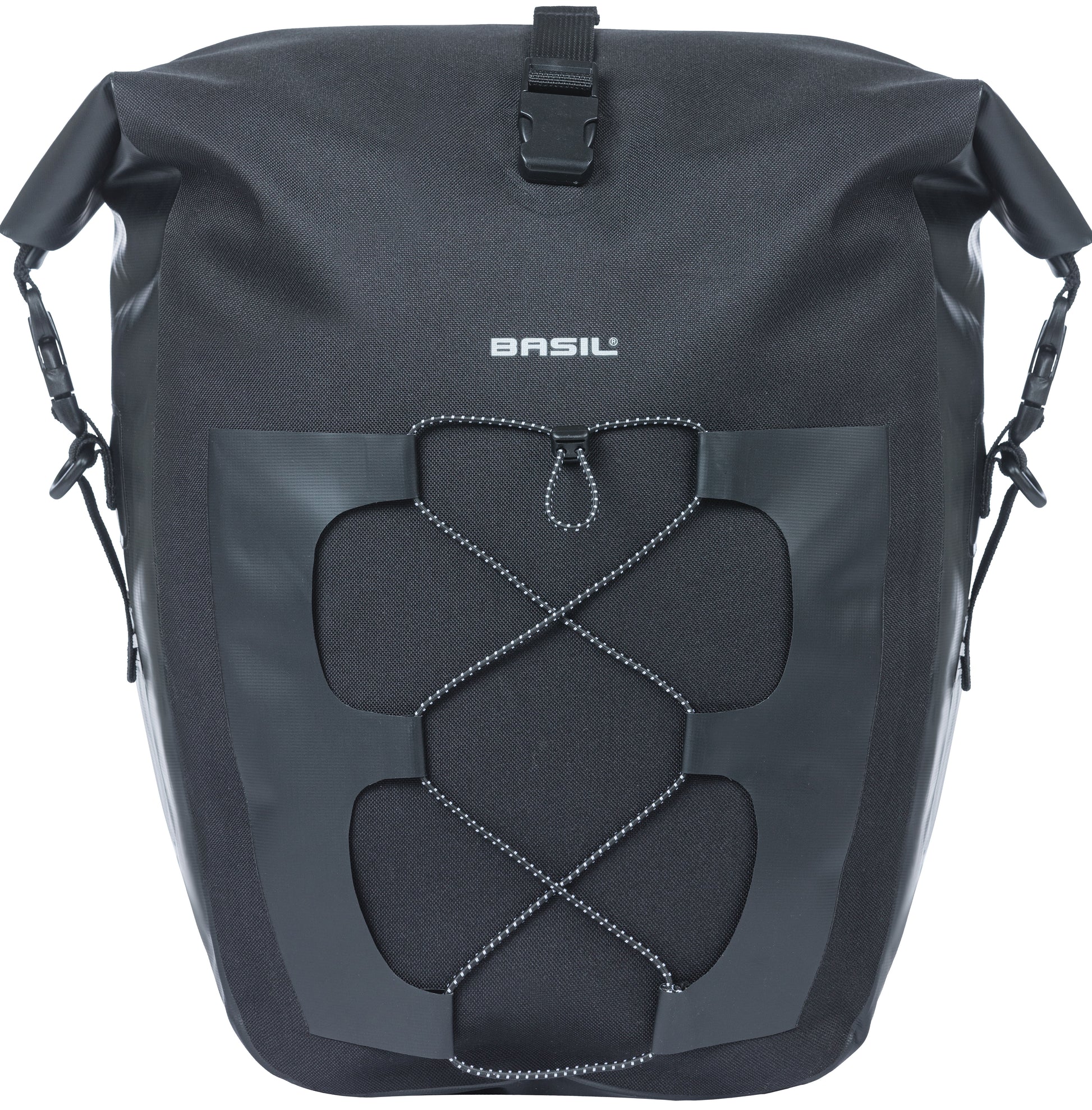 De Basil Navigator Waterproof is een enkele fietstas met een inhoud van 25 tot 31 liter. Deze tas is 100% waterdicht (IPX 3) en is gemaakt van tarpaulin en 600D polyester. De fietstas heeft een roltopsluiting met een extra instelbare sluiting, waardoor je zelf kunt kiezen hoe je de tas sluit. Aan de voorzijde van de tas zit een reflecterend elastiek, waar je bijvoorbeeld een casque of natte regenjas in kunt opbergen. De tas is eenvoudig mee te nemen dankzij het handvat en de verstelbare schouderband. Je bevestigt de fietstas met het Basil Hook-On systeem aan de fiets, en je kunt de tas extra bevestigen aan het frame van de fiets met het instelbare haakje aan de onderzijde. De Basil Navigator Waterproof is geschikt voor elektrische fietsen, stadsfietsen en city-trekking fietsen. Het is een ideale tas voor boodschappen doen, woon/werkverkeer, recreatieve uitstapjes en meer. Product specificaties - Model: Achtertas - Dubbel of enkel: Enkel - Volume (Ltr): 31,0 - Afmetingen: 32 x 15 x 37 cm (Buitenwerkse maten) - Geschikt voor: Elektrische fiets, stadfiets, city-trekking fiets - Activiteit: Boodschappen, woon/werk, recreatief, eropuit - Materiaal: Tarpaulin en 600D polyester - Kleur: Zwart - Systeem: Basil Hook-On systeem - Ook te gebruiken als: Schoudertas - Toepassing: Bagagedrager - Extra vak voor: Compressievoorvak inclusief reflecterend elastiek - Sluiting hoofdvak: Roltopsluiting - Laptopvak: Nee - Zijvak(ken): Nee - Voorvak(ken): Ja - Diefstalbeveiliging: Nee - Waterbestendig: Waterdicht - Snelbinders mogelijk: Ja - Afneembaar: Ja - Handvat: Ja - Draagcapaciteit: Max. 5 kg - Garantie: 2 jaar, via het verkooppunt waar je het product hebt gekocht - Binnenvak: Nee