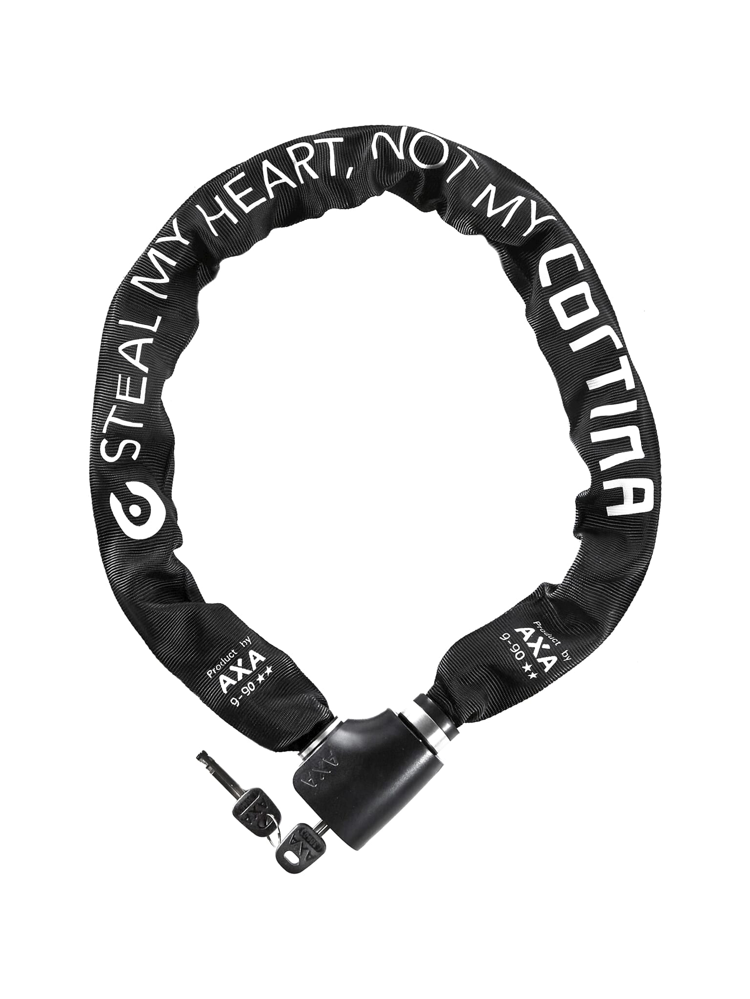 Dit AXA Absolute kettingslot met witte 'Steel My Heart, Not My Cortina' bedrukking is speciaal gemaakt om je Cortina fiets extra te beveiligen. Het is een kwalitatief hoogwaardige ketting voor langdurig parkeren.