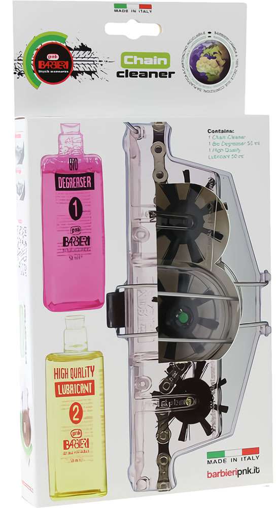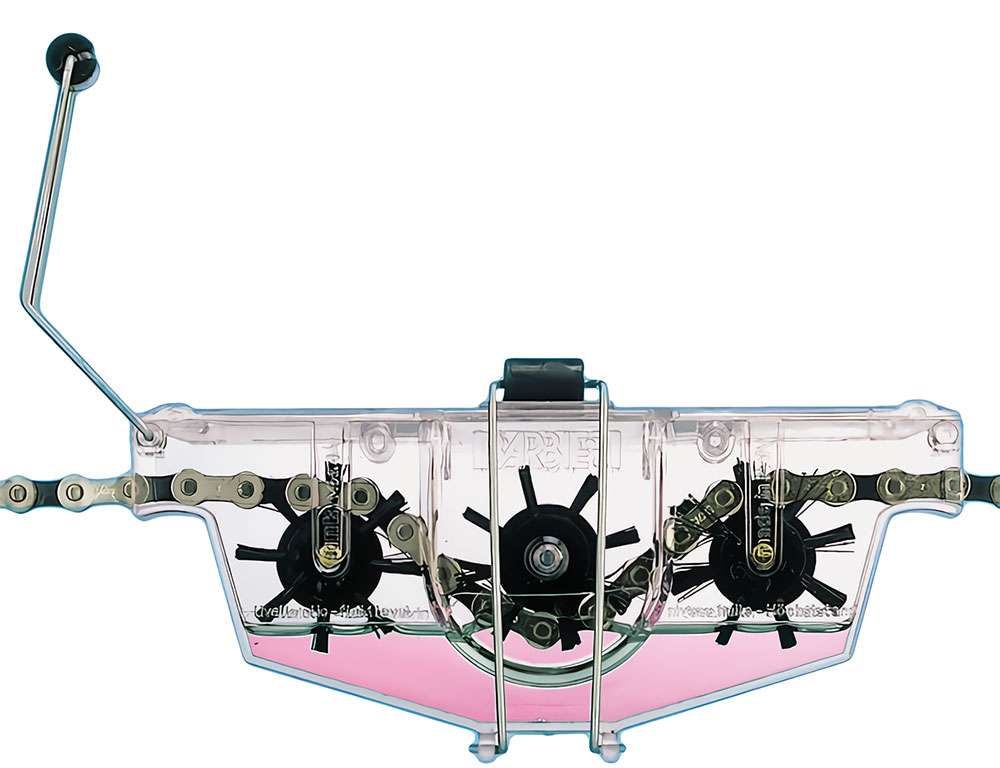 Een kettingwasstraat met borstels om uw ketting te reinigen. Compleet met reinigingsvloeistof en smeermiddel.
