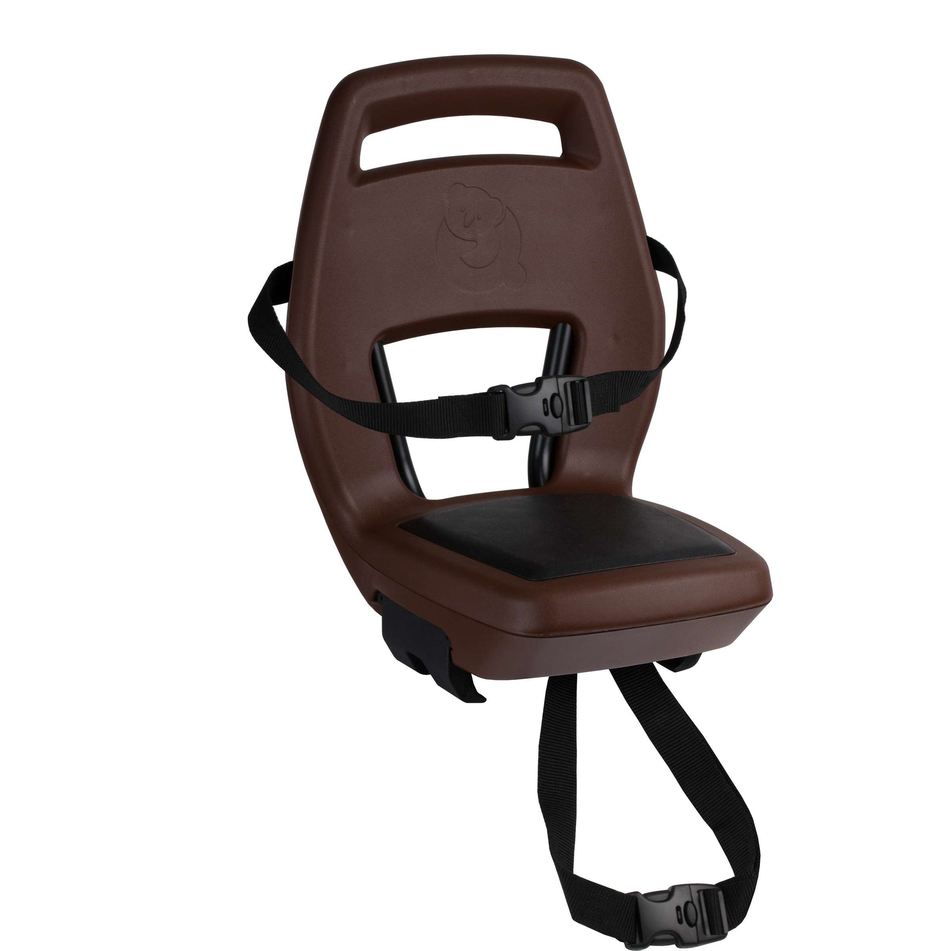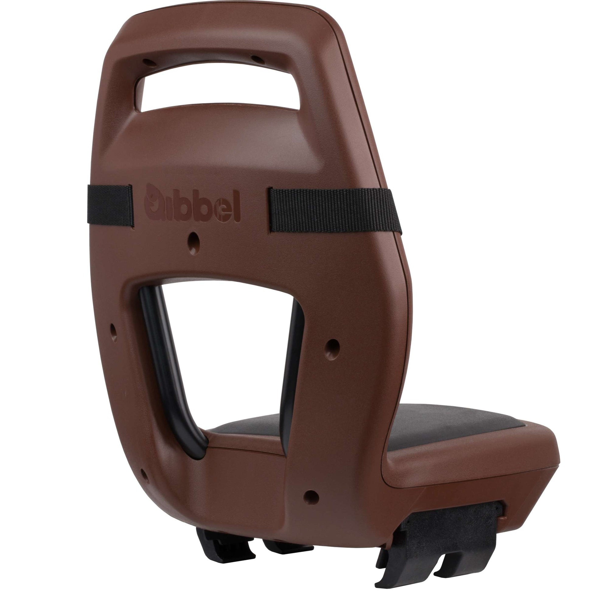 Qibbel Junior 6+ zitje in de kleur bruin/zwart, compleet met voetsteuntjes, beschermplaten en gordel geschikt voor bagagedragers van 11 tot 17 centimeter breed en met een buisdiameter van 10 tot 22 millimeter.r.